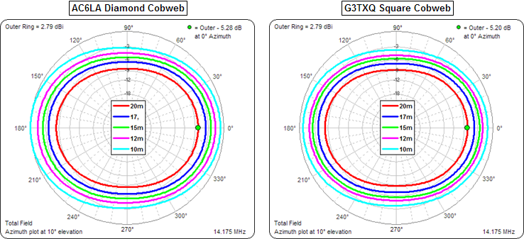 Be aware that the balun box can get quite heavy, and in the diamond design it's right at the extremity of the spreader; so make sure the spreader is strong enough to take the extra weight. Alternatively just continue the 12.5 ohm line around the tip of the spreader, back through the centre of the spreader, to the balun box located and supported at the hub. And later he added this comment: I tried the "diamond configuration" with several bands today, but I confess I got tired of making up the 12.5 ohm interconnects before I'd done all five bands ... and the Rugby World Cup final on TV was proving more attractive! But I'd seen enough to be confident a 5-band version would work as predicted.Another idea I tinkered with is to combine a diamond shape with a common (aka "ganged") element feedpoint like a normal (G3TXQ or G3TPW) cobweb/CobWebb. That eliminates the need to build 12.5 ohm "interconnect" lines between separate element feedpoints as well as eliminating the need for a separate feedpoint support tube.
