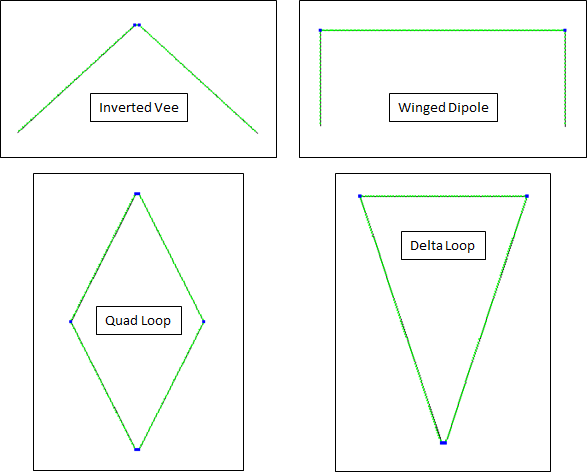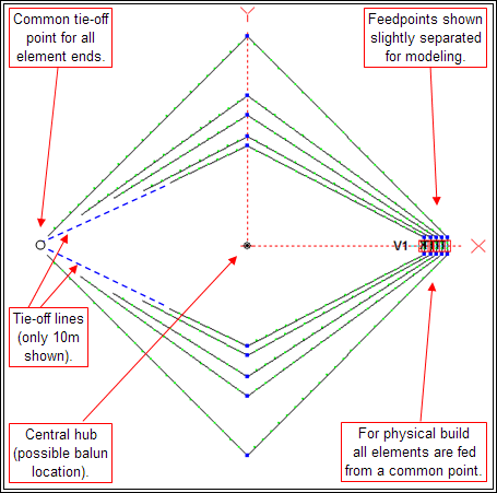 Here's a different variation; a diamond shape with separate element feedpoints (like a hexbeam) as opposed to "ganged" feedpoints.