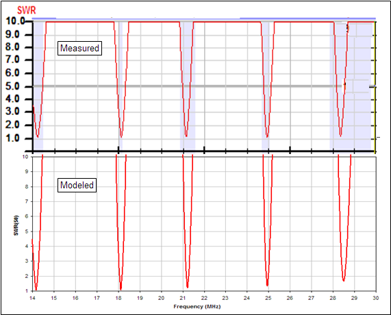 Not bad. I couldn't quite get the minimum SWRs on 12m and 10m that Steve got but otherwise the model and the measurement are remarkable close.