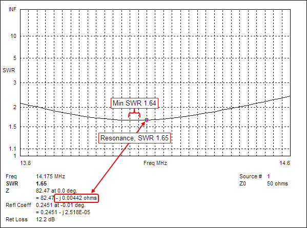 One other interesting feature of the cobweb I forgot to mention: try plotting its resonant frequency - say for the 20m band - at varying heights above ground, and compare that with a linear dipole.To do this with EZNEC typically the first step would be to run a frequency sweep and look at the SWR plot to find the minimum |X| frequency (resonance). That will not necessarily be the same as the minimum SWR. You'd probably want to include out-of-band frequencies to make sure you don't miss the dip. For a 20m antenna that might be 13.8 to 14.6 MHz and the plot might look like this.