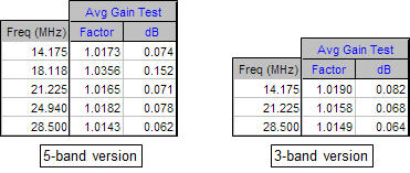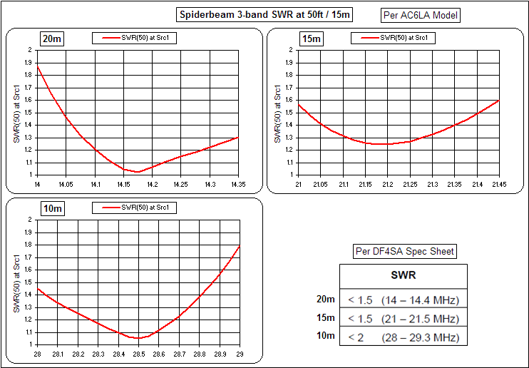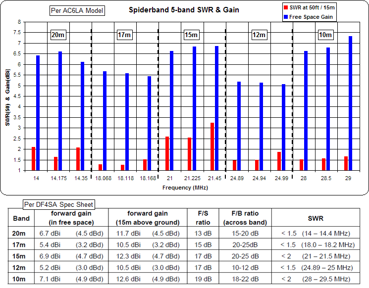 |AGT| < 0.2 dB: "Model is considered to have passed the test and is likely to be highly accurate."Below are the modeled results for SWR and Gain for the 5-band version at three frequencies in each band. The table below the chart is from the Spiderbeam spec sheet