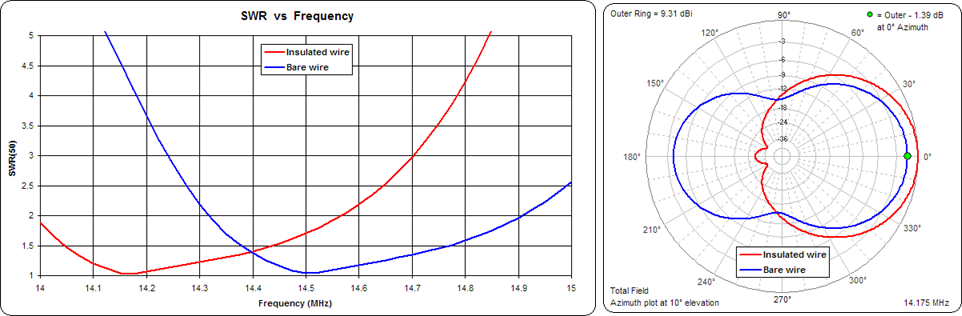 (link) , 0.0445" diameter with a 0.020" polyethylene insulation (assumed dielectric constant 2.26). The models reflect that.If you use bare wire without changing the element dimensions these are the kind of differences you'll see. This is for the 3-band model on 20 meters.