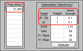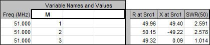 M = 2 and optimize on G and H. This time the temporary load will be +j50 ohms and when that load is removed the optimized loop 2 feedpoint impedance of 50+j0 will become50-j50 ohms.When finished tuning both loops set