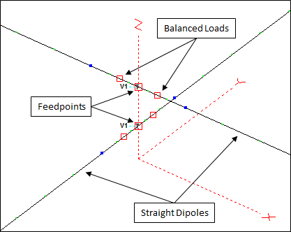 Note that for modeling purposes the two elements are physically separated by a small amount. They are then connected electrically to the common point V1 by essentially "zero" length transmission lines. (Think of the two "V1" annotations as being combined into one and located midway vertically between the two feedpoints.) Connecting the elements this way results in more accurate modeling results as opposed to connecting the elements via a separate short wire. Of course in actual construction each element would have a break in the center and both elements would be in the same plane.