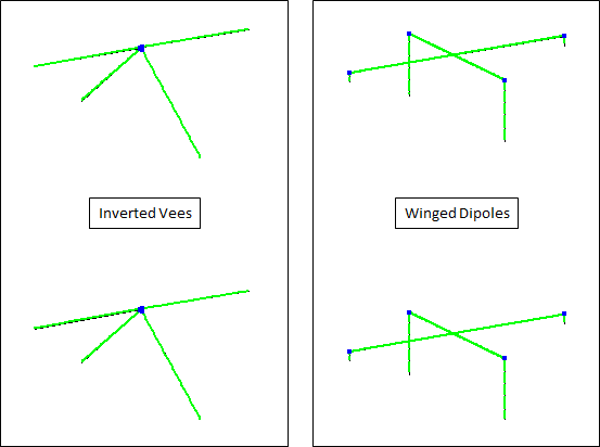 -50 jX ohms. Once that reactance value is known, balanced inductive loads (coils) will be automatically calculated and added such that one dipole's impedance is raised to 50+j50 ohms (larger inductance coils) while the other dipole's impedance is raised to only50-j50 ohms (smaller inductance coils).Not matter what type of geometry is used you can create a vertical stack of two turnstiles (two pairs of two elements), just as with stacking Yagi antennas. Because of the mutual coupling between the pairs the element shapes will be different. Here are the approximate shapes needed for a stack of inverted vee turnstiles and a stack of winged dipole turnstiles. Notice that one vee is almost a straight dipole and one winged dipole has only minimal wings.