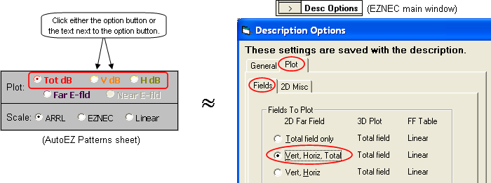 You can use the Tot dB / V dB / H dB option buttons to display the Total far field space wave gain or just the Vertical or Horizontal polarization components of the far field. This is similar to clicking the Desc Options button on the EZNEC main window, selecting the Plot and Fields tabs, then choosing the "Vert, Horiz, Total" option. The difference is that with AutoEZ you see only the chosen component; with EZNEC you see all three at the same time on the EZNEC 2D Plot window.