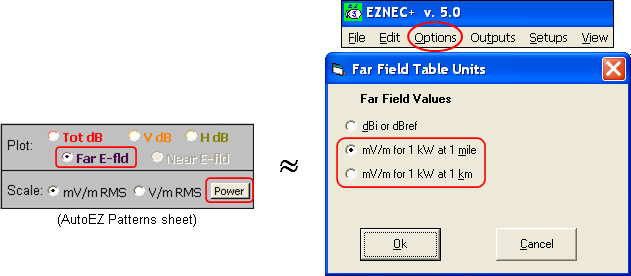 You can use the Far E-fld option button to display the field strength in mV/m or V/m rather than dBi. This is similar to clicking the Options menu on the EZNEC main window, then Far Field Table Units, then selecting either of the mV/m options. (Note that this changes only the EZNEC Far Field Table, not the EZNEC 2D Plot.) However, with AutoEZ you can choose a specific power level and a specific distance.