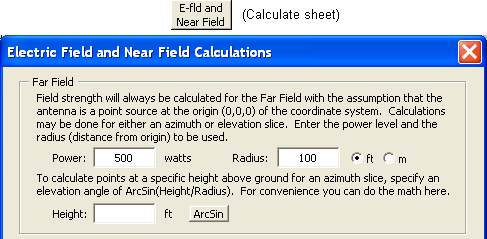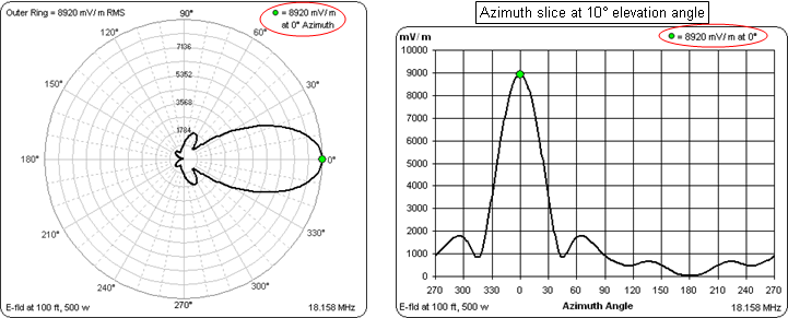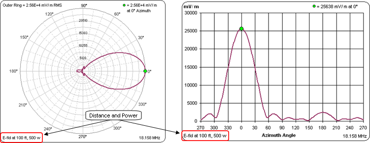 The distance and power for the Far E-fld are shown in the lower-left corner of each (full size) chart. Note that the circular gridlines on the polar chart will have rather arbitrary values. You may find it easier to use the rectangular view. Also, the rectangular view will always show mV/m even if you choose V/m for the polar view.