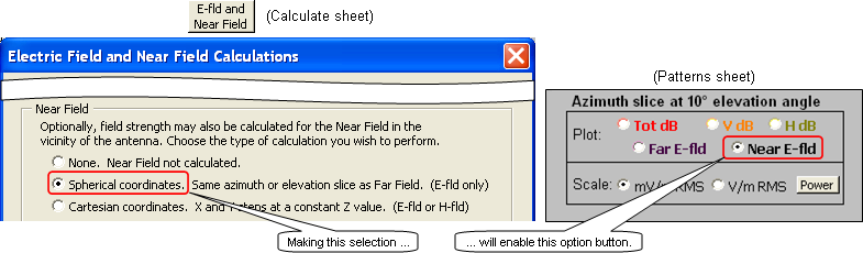 To do Near Field analysis you also use the E-fld and Near Field button on the Calculate sheet. You can choose either Spherical or Cartesian coordinates. This choice affects both the way the points in space where the field strength will be calculated are defined and the way the results will be displayed.