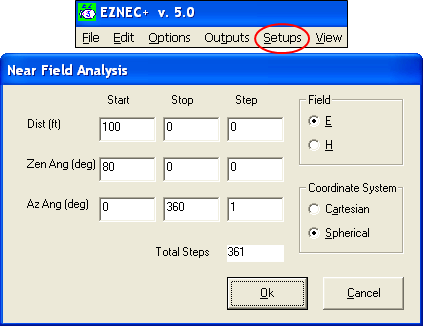 This is equivalent to clicking the Setups menu on the EZNEC main window, then Near Field, then making entries in the EZNEC dialog as shown below. Note that when using the EZNEC dialog you specify the zenith angle instead of the elevation angle. (The EZNEC dialog is shown just for comparison. AutoEZ will handle all of this under the covers.)