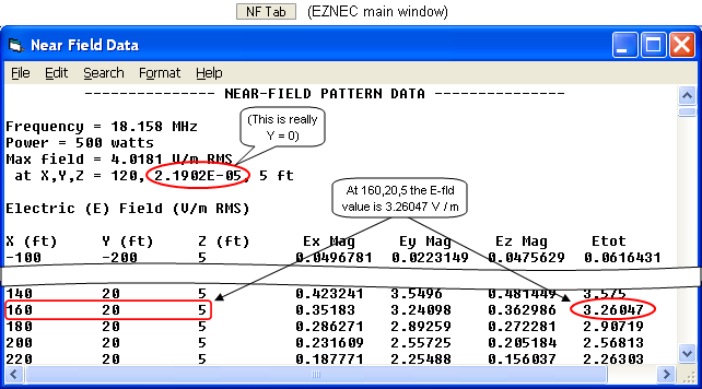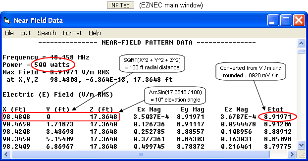 After that is done click the "NF Tab" button on the EZNEC main window. EZNEC always shows Near Field data in Cartesian coordinates even if the points in space were specified using Spherical coordinates. A bit of trigonometry will convert the X/Y/Z coordinates shown in the EZNEC Near Field Table to the radius and elevation angle that were used by AutoEZ.