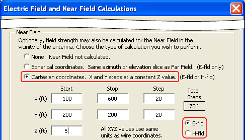 Instead of Spherical you can use Cartesian coordinates to define the points in space. You specify an X/Y grid of points at a constant Z (height) value. When Cartesian coordinates are used you can also choose between E-fld and H-fld.