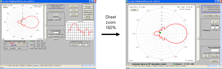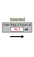 To resolve fine details for deep nulls on the polar view you can use the Zoom button. Each click will subtract 10 dBi from the outer ring setting. Click a total of 4 times to "unfreeze" the outer ring and return to normal operation.
