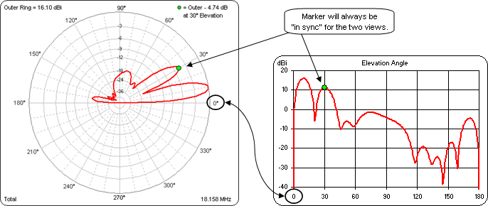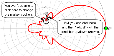 - You can click on the primary (red) trace of either the polar or rectangular chart. The angle of the marker (elevation or azimuth) will stay "in sync" between the two views.