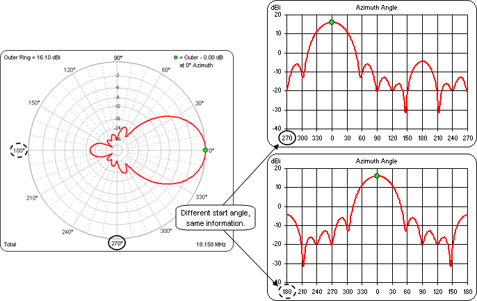 -99.99 dBi . Rather than plot these meaningless numbers you can choose a Low Clip limit for the rectangular view, set at-40 dBi above.For azimuth plots (or Free Space elevation plots), when the pattern range is 360 degrees, you can choose the Start Angle to be used for the left vertical gridline. You may wish to align the rectangular view such that the forward lobes of the pattern fill the left half of the chart and the back lobes fill the right half (below, right top). Or you might want to center the main forward lobe in the center of the chart (below, right bottom). In the illustration below both rectangular charts show the same information, the top with a start angle of 270° and the bottom with a start angle of 180°