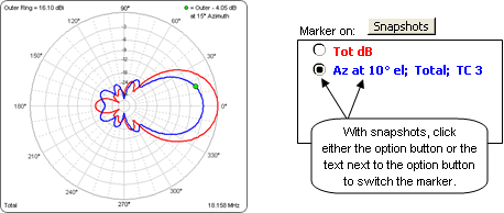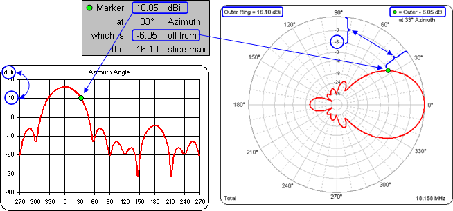 In the illustration below the marker has been placed at 33° azimuth angle. At that angle the field strength is 10.05 dBi, just slightly above the "10" horizontal gridline on the rectangular view. The same field strength is also 6.05 dB less than the 16.10 dBi outer ring setting, just slightly below the