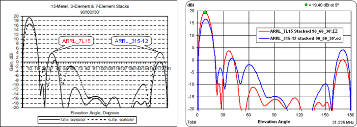 If you have a recent copy of The ARRL Antenna Book you may have seen rectangular patterns in that publication. For example, below on the left is Fig 36 from Chapter 11 of the 20th and 21st editions. It shows the elevation pattern for two different stacks of Yagis, 7 elements stacked at 90/60/30 ft and 3 elements stacked at 90/60/30 ft. On the right are the same patterns in AutoEZ, created by opening and calculating the "ARRL_315-12" model, taking a snapshot, then opening and calculating the "ARRL_7L15" model.