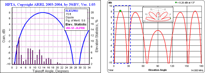 Below on the left is the pattern from HFTA for a 14 MHz generic dipole at 75 ft along with the propagation statistics for the path from Northern California to Japan and the Far East. On the right is the AutoEZ pattern for the EZNEC model BYDIPOLE.EZ, raised to a height of 75 ft. The blue dashed box shows the portion of the elevation pattern that is common to both programs.