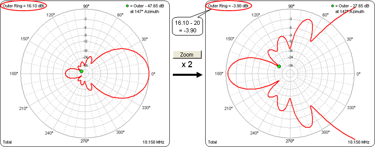 In the animation below on the left the outer ring changes from 16.10 dBi for the total field, to –17.14 dBi for the vertical component, and back to 16.10 dBi for the horizontal component. On the right the outer ring has been frozen at 16.10 dBi, making it obvious that the vertical component is much smaller than the horizontal.