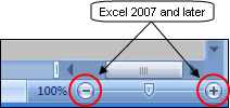 With Excel 2007 and later you can use the mouse scroll wheel, as above, or you can use the zoom controls in the status bar at the bottom of the window. Each click on the "+" or "–" button will increase or decrease the magnification of the current sheet tab by 10%.