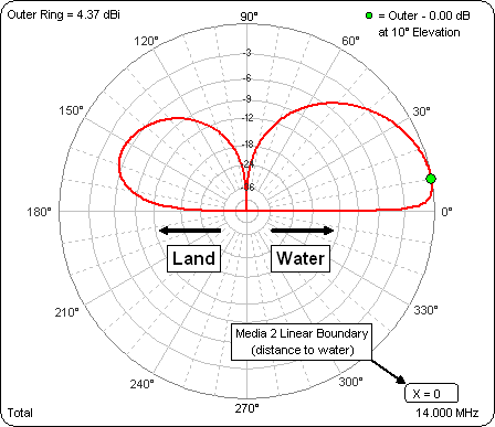 Using a formula allows you to create a "variable sweep" set of test cases. Here is how the far field elevation pattern for a 20m quarter-wave vertical changes as the X coordinate of the linear boundary is varied, with sandy ground on the left and salt water X feet from the antenna on the right. The X coordinate value (distance to water) is shown in the lower right for each frame of the animation.
