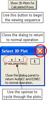 When you click the button AutoEZ will a) put EZNEC into TraceView mode and minimize the EZNEC window, b) create a small "postage stamp" dialog window in the lower-right corner of your desktop, c) instruct EZNEC to show a TraceView 3D plot for the first available PF3 file. You can then use the spin button on the "Select 3D Plot" postage stamp dialog to cycle through all the PF3 files. You can resize the 3D plot window and change the axes orientation as desired. The axes orientation will "persist" from one plot to the next.