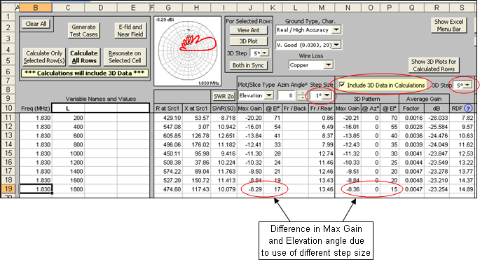 (J-K) and the "3D" columns(N-O-P) , depending on whether you have chosen the same or a different step size for each.If you wish you can verify the AutoEZ 3D data directly in EZNEC. Select any cell in the desired row and click the AutoEZ 3D Plot (For Selected Row) button. In this case, when you wish to verify the 3D data, make sure the step size used for plotting matches the step size used for data. In the general case it is not necessary to have these two step sizes be equal.