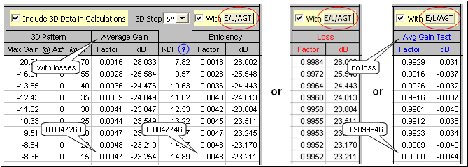 When you select the optional With E/L/AGT checkbox AutoEZ will, in addition to doing the normal 3D calculations, build a temporary model file with all loss elements removed. That is, the model will have no ground loss, no wire loss, no load loss, no transmission line loss, and no L network loss. This model is sent to EZNEC with instructions to create a "no loss" PF3 file. AutoEZ reads this file then calculates and stores the "no loss" average gain, which is also called the Average Gain Test value. This value can be used with the previously-calculated average gain "with losses" value (column Q) to calculate overall system efficiency and overall system loss, and is used directly to show the Average Gain Test value, via the following relationships: