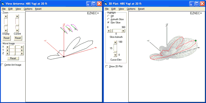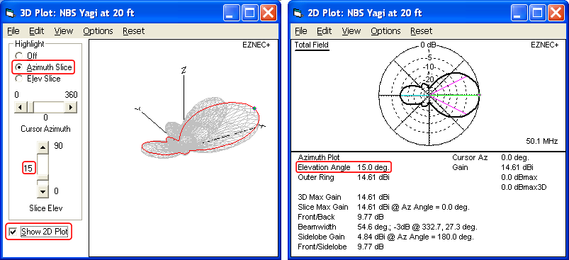 When viewing an EZNEC 3D plot, if you highlight an azimuth or elevation slice you can also show the EZNEC 2D plot for that slice. For example, this shows the azimuth slice at 15° elevation highlighted on the 3D plot and the corresponding 2D azimuth plot at that elevation angle.