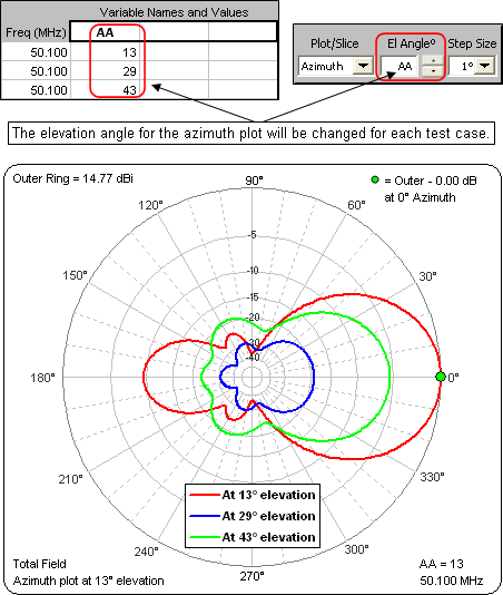 An alternative way to show different 2D slices is to use a variable to control the plot angle on the AutoEZ Calculate sheet. Variable AA is shown below but any unused variable name will do. Then on the Patterns sheet you can step through the test cases to see the pattern at different angles. (This feature added as of AutoEZ update 2.0.12.)
