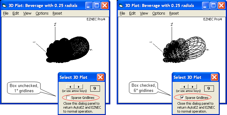 There may be times when you want to use a smaller 3D step size of 1° or 2° in order to get more resolution in the calculated results shown in columns N through S. You can use this small-step data with the Show 3D Plots button and EZNEC TraceView but the 3D plots will be less than optimal. To accommodate this situation, when the PF3 file has a step size of 1° or 2° you will see a Sparse Gridlines checkbox. If you select this option AutoEZ will create a temporary PF3 file just for viewing which has a 6° step size. (If the original PF3 file has a step size of 5° or 10° the Sparse Gridlines checkbox is not shown.)