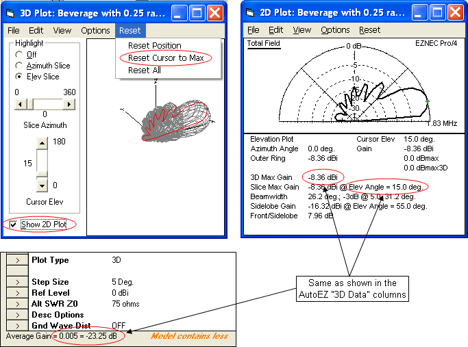 In the EZNEC 3D Plot window highlight a slice (elevation in this case) and then click Reset > Reset Cursor to Max if necessary. Then click the "Show 2D Plot" option box. In the EZNEC 2D Plot window click View > Show Data if necessary. The data shown on the 2D plot along with the Average Gain shown at the bottom of the EZNEC main window will be the same as is shown by AutoEZ.