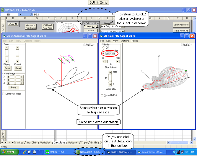 Sometimes it is helpful to see both the wires of the model and the 3D radiation plot at the same time. EZNEC has a powerful feature for this situation and AutoEZ makes it easy to invoke that feature. On the Calculate sheet the Both in Sync (For Selected Row) button does just what the name implies. Using the frequency and variable values (if any) for the selected row, AutoEZ will build a model and send it to EZNEC with instructions to first run the NEC engine, then show the View Antenna window, then also show the 3D Plot window. AutoEZ then manipulates the size and position of these two sub-windows such that they are side-by-side and span almost the entire desktop.