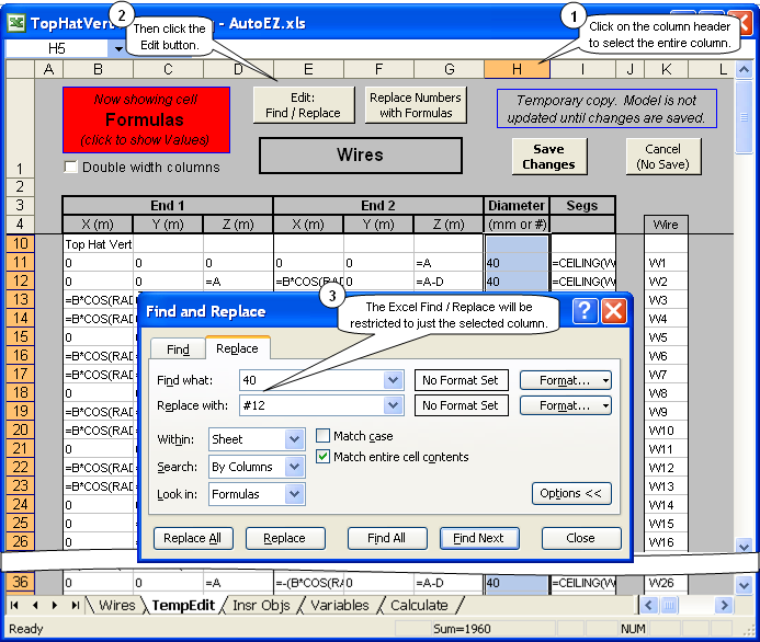 However, "40" is not a very unique string. If you were working with a model that had several dozen wires still with straight numeric values for the XYZ coordinates along with straight numeric values for the segment counts, Excel may find and replace "40" with "#12" in cells other than where you intended even if you are careful to check the "Match entire cell contents" box. To prevent this, first click on the "H" column header to select the entire H column. Then when you use Excel's Find/Replace the search will be limited to just that column.