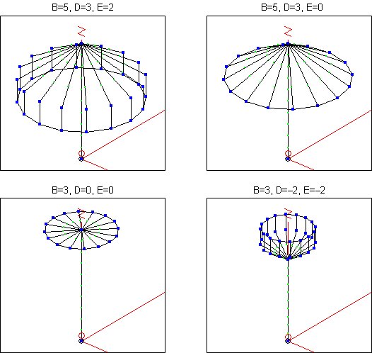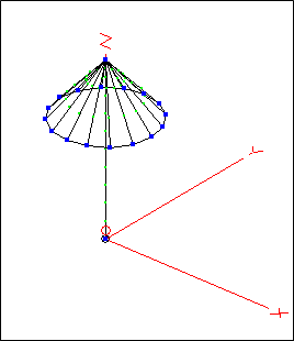 "variable-ized" version of a somewhat arbitrary model. You may or may not have an interest in this particular type of antenna, but you might be able to apply some of the EZNEC model-building techniques to your own models.The model to be built in this example is a "Top Hat" vertical for 40 meters. The top hat consists of 16 sloping wires, perhaps guy wires leading from the apex, connected to 16 vertical wires. The lower ends of the vertical wires are connected with a perimeter wire. Believe it or not, all dimensions of this antenna will be controlled with just a few variables.