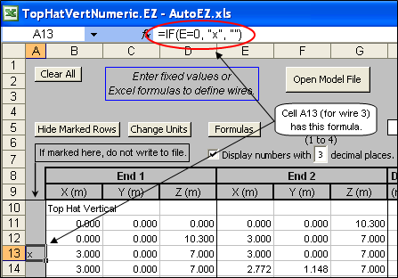 Select cell A13 (13 is the row for wire 3). In the formula bar, near the top of the Excel window, enter the formula shown above. The Excel "IF" built-in function has the syntax "IF(logical_test, [value_if_true], [value_if_false])". That is, Excel checks whether a condition is met and returns one value if true or another value if false. In this case if the value for E is 0 the wire will be "marked" with an "x" character. But if the value for E is not 0, a null string ("") is used. Entering a null string is the same as entering nothing at all so the wire is not marked.