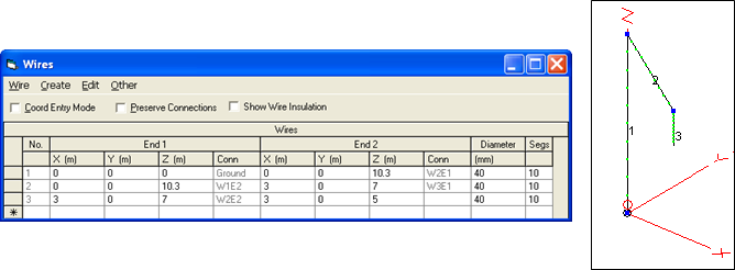 End 1 values of "w2e2" andEnd 2 values of (3,0,5). You've now created a sloping wire (wire 2) with a drop of 3.3 meters (10.3 minus 7) and a vertical wire (wire 3) with a further drop of 2 meters (7 minus 5).End 1 of wire 2 is connected toEnd 2 of wire 1 andEnd 1 of wire 3 is connected toEnd 2 of wire 2.