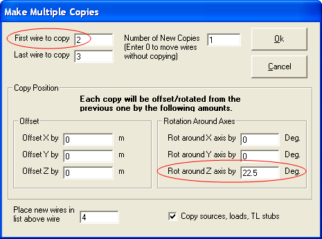 If using EZNEC+ or EZNEC Pro: In the Wires window, click on the menu item 'Wire' and then select Make Multiple Copies. In the dialog window that appears change the "First wire to copy" from 1 to 2. Change the "Rot around Z axis by" from 0 to 22.5. Click OK. Back in the wires window, add another new wire (6) going from w3e2 to w5e2. Then click the button on the left side of the wire 4 row to select the entire row. Hold down the Shift key and click the button to the left of the wire 5 row. With both wires 4 and 5 selected press the Delete key to remove those wires. What was wire 6 will become wire 4.