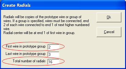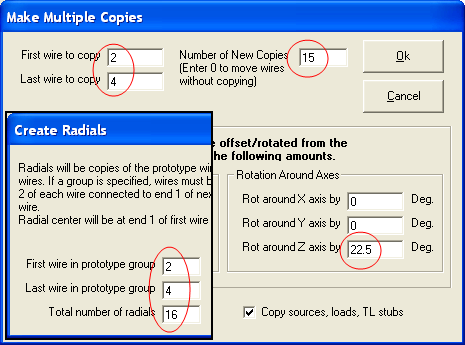 If using EZNEC Std or EZNEC Demo: These EZNEC program types do not have the Make Multiple Copies function but you can accomplish the same thing using Create > Radials. Change the "First wire in prototype group" from 3 to 2 and change "Total number of radials" from 4 to 16. Click OK. As above, add another new wire (34) going from w3e2 to w5e2. Now delete wires 4 through 33. What was wire 34 will become wire 4.