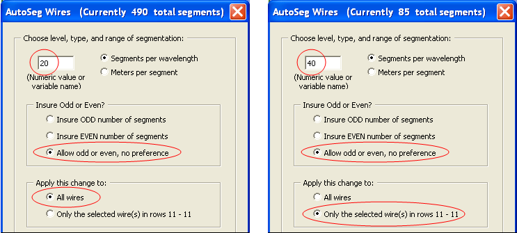 Start AutoEZ if necessary and open this new model file. On the AutoEZ Wires sheet note that the number of segments is 490. That's because each of the 48 new wires that were created had, by default, the same number of segments (10) as wire 1 of the original VERT1.EZ model and wire 1 is more than twice as long as any of the other wires. So the first thing to do is click the AutoSeg button and change the segmentation density for all the wires to a more reasonable value like 20 segments per wavelength. After that you can then select any cell in row 11, the row for wire 1, click the AutoSeg button again and enter twice the segmentation density for that single wire.