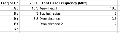If you set E (the drop distance for the vertical wires of the top hat) to 0 then the horizontal perimeter wires will "move higher" and connect to the sloping wires, but you'll get an error message for the vertical wires (now length 0) concerning either segments or wire length. So do you have to construct a completely new model without the vertical top hat wires? Not at all. You can "mark out" the vertical wires. When you "mark out" one or more wires (similar to "commenting out" a line of code if you have a programming background), the "marked" wires are not included in the temporary model file that is sent to EZNEC.