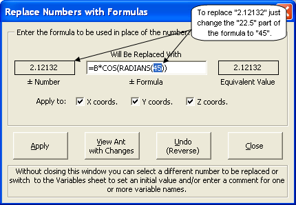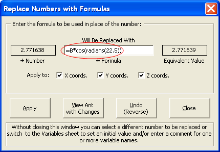 Re-check the "X coords" and "Y coords" boxes. Select one of the "3" values and enter the formula "=B". Apply the change. Without closing the dialog window, select one of the "2.771638" values. Expand the formula by typing"*cos(radians(22.5))". Variable B is the radius of the top hat, "cos" is the Excel cosine function which expects its argument to be in radians, "radians" is the Excel function which converts degrees to radians, and "22.5" is the angle in degrees of this spoke in the XY plane. Remember you can type the formula in upper, lower, or mixed case. Also remember that as you type the formula is re-evaluated for each new character entered. If what you have typed so far is not a valid Excel formula you will see "???" in the "Equivalent Value" field.