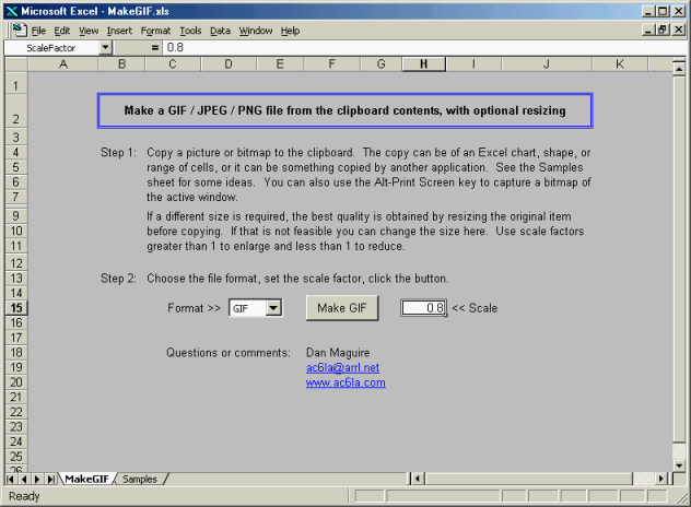 Download the MakeGIF utility. Free. Requires Excel 97 or later.