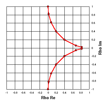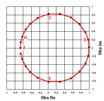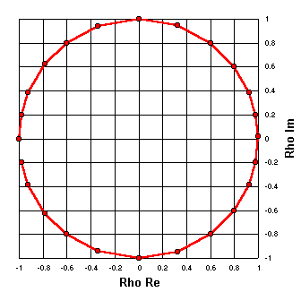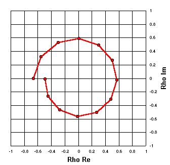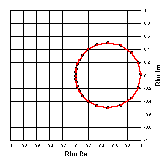 Because RG-174 is a lossy line the plot is in the shape of a spiral rather than a circle. The reflection coefficient magnitude drops noticeably as the distance from the load is increased. Rho magnitude at the load is 0.667 (SWR 5:1) while after ½ wavelength it has dropped to 0.494 (SWR 2.95:1). The rho angle starts at (approximately) 180° and sweeps through an entire circle to end up back at (approximately) 180°. |