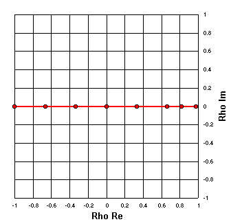 Now let's plot the real and imaginary components of the reflection coefficients from a set of arbitrary Z values with the X component held constant. In this case R = 0, 10, 25, 50, 100, 250, 500, 5000 and X is held constant at 0. |