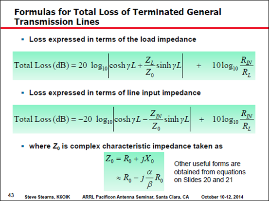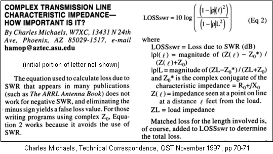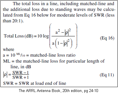 The full K6OIK presentation can be downloaded here. It includes a very nice explanation of the flawed assumption in the ARRL formula and why the formula is accurate only in special cases, none of which have anything to do with the stated warning of "SWR levels less than 20:1".