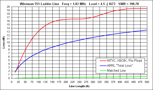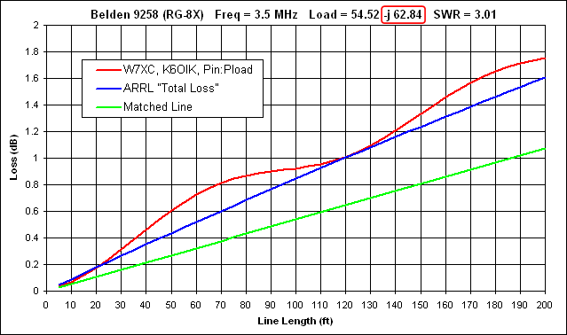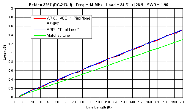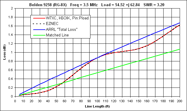 The W7XC, K6OIK, and Pin:Pload formulas all produce identical results. The EZNEC "lossy transmission line" values differ from the more precise values by an average of 0.004 dB, barely detectable on the plot. On the other hand, the ARRL "Total Loss" formula is accurate only by happenstance at certain line lengths. And note that the SWR at the load is 3.20:1, not at all extreme.