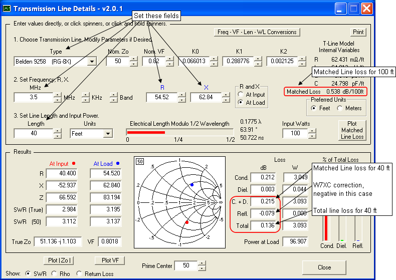 Several different tools are available which will do all the math for you. Each example shown below is for the 80m dipole at 3.5 MHz with a feedpoint (load) impedance of 54.52+j62.84 ohms fed with 40 ft ofRG-8X. First up is TLDetails. Select a line type and enter the frequency, load R/X, and line length.