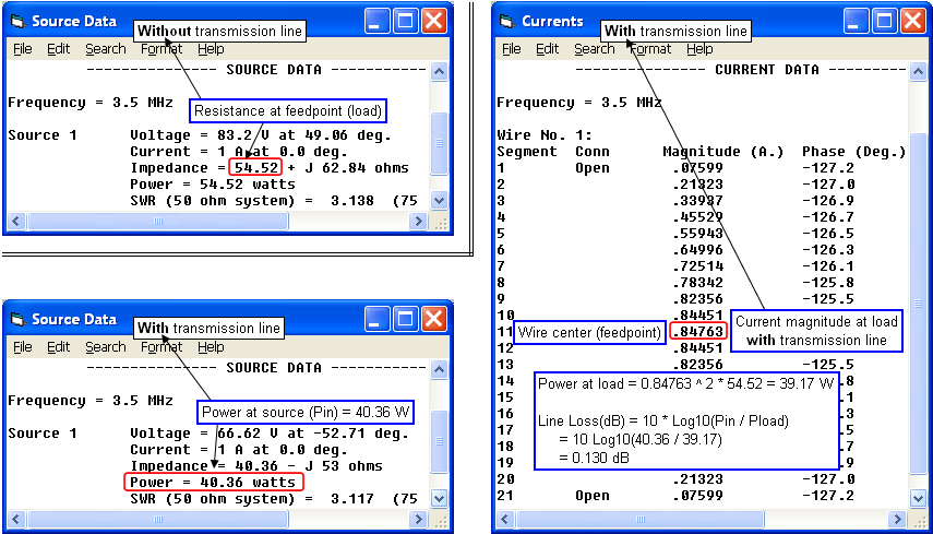 Pload = |Iload|^2 * RloadTotal line loss (dB) = 10 * Log10(Pin / Pload)Still another way to compute total line loss is to use the "lossy transmission line" feature of EZNEC v. 5.0.