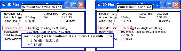 Call that Method A; it's just pocket calculator math. But there's an even easier Method B. In the first model, without a transmission line, make a note of the "Slice Max Gain" as shown in the 2D Plot window. Then add the transmission line and note the new "Slice Max Gain". The difference between those two values is the power that was lost in the line. The value will be limited to two decimal places because that's the limit on gain shown by EZNEC. Don't lose any sleep over that.